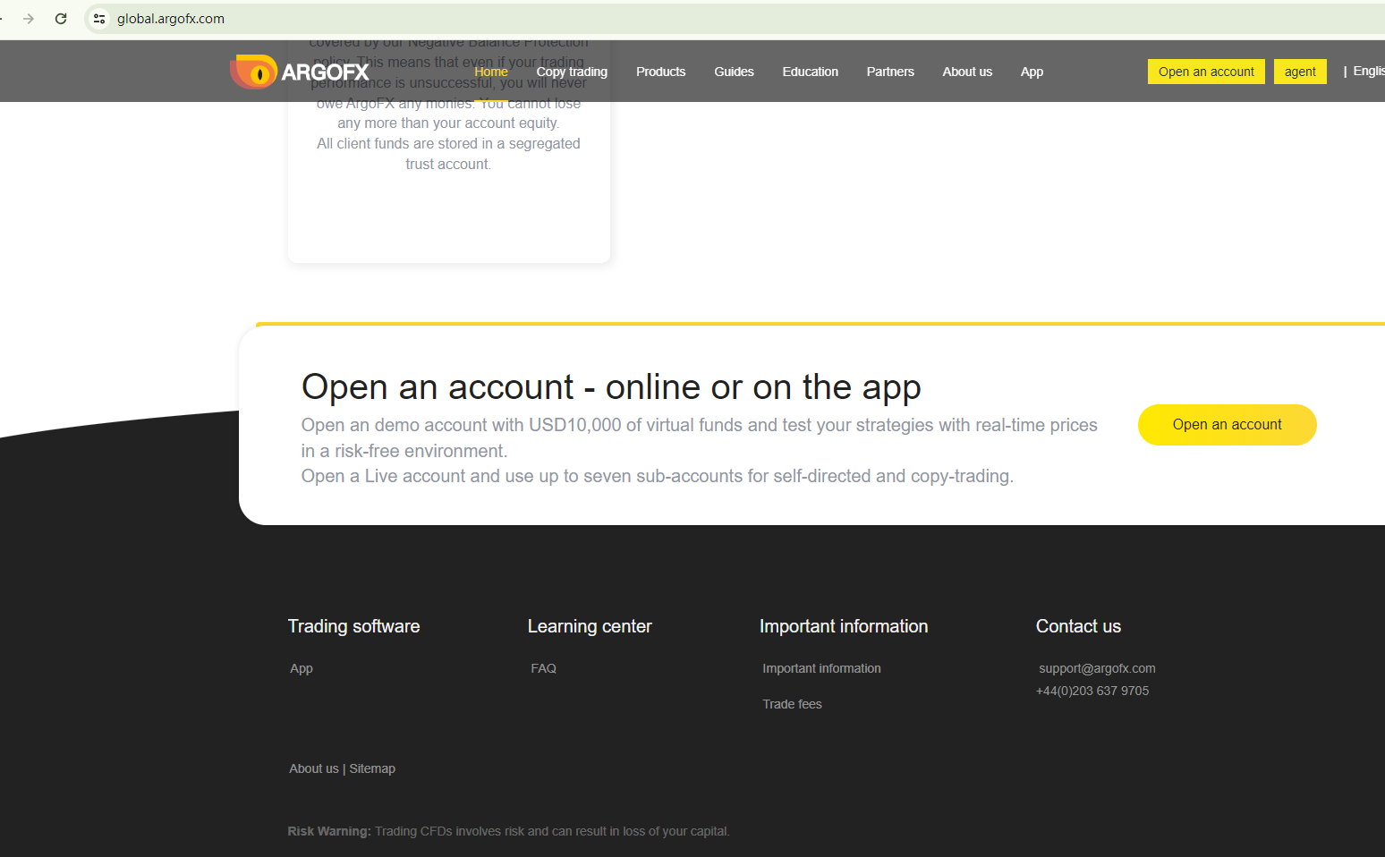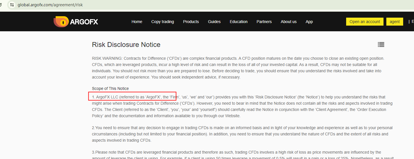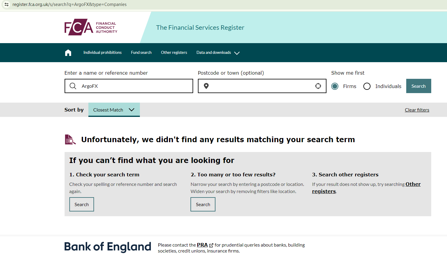 Conversely, in its Risk Disclosure Notice, it identifies itself as ArgoFX LLC. Despite listing a UK phone number as its hotline, our search in the Financial Conduct Authority (FCA)'s register found no record of it.