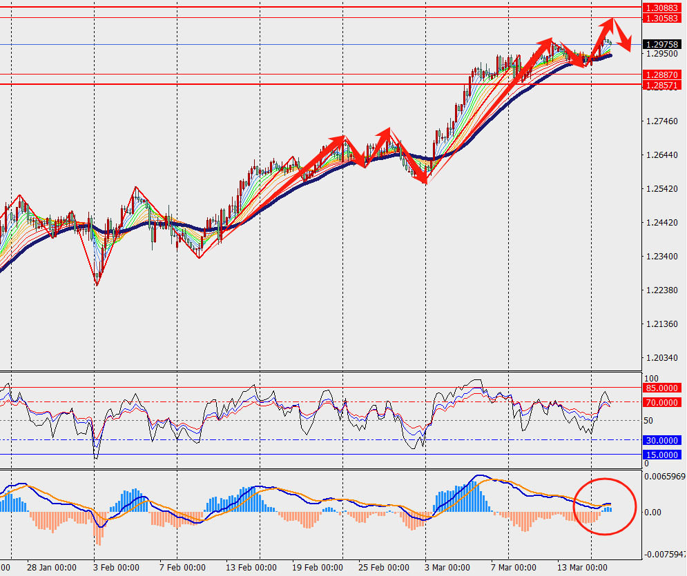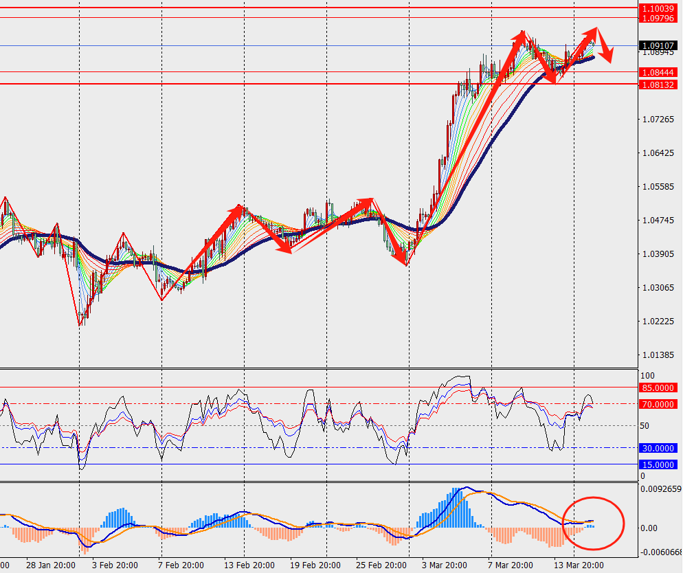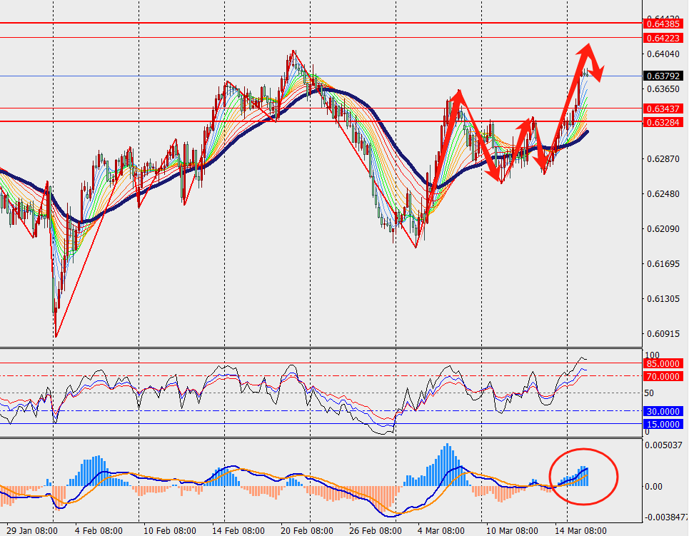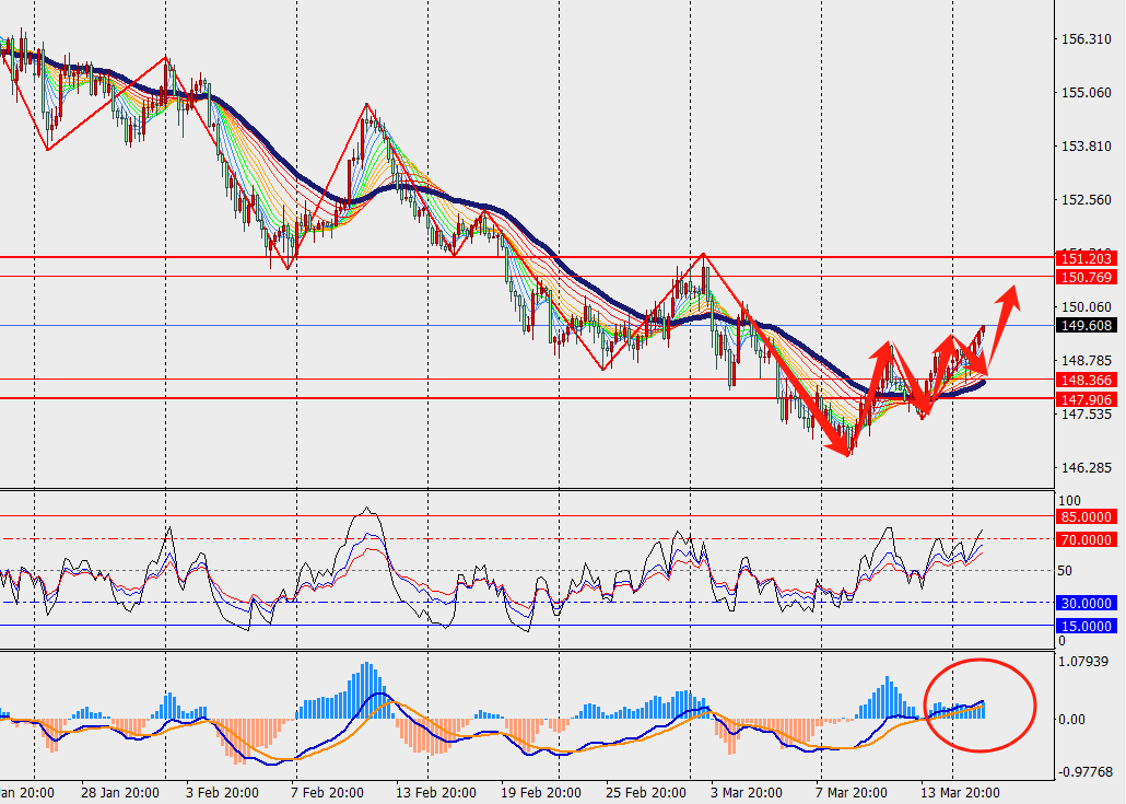 技术面: 欧元兑美元H4级别高位反弹,并在48日多空分界线上方运行。然而,MACD双线与量能柱在零轴上方收敛。欧洲历史性地转向扩大财政支出,促使资产管理公司将看涨欧元头寸推高至五个月来的最高点,而对冲基金则减少了对欧元疲软的押注。