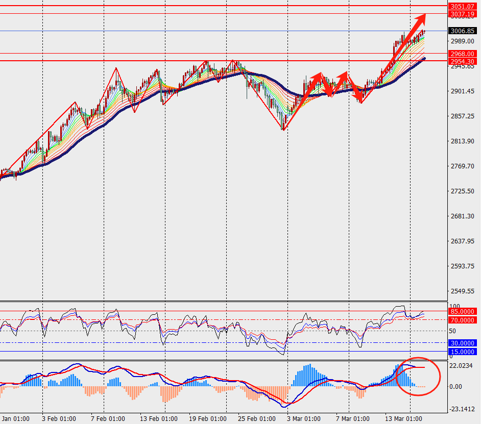 技术面:黄金H4级别高位反弹,并在48日多空分界线上方运行。此外,MACD双线和量能柱在零轴上方收敛。黄金突破3000美元里程碑的原因是鉴于特朗普给股市造成的动荡,陷入困境的投资者寻求终极避险资产。