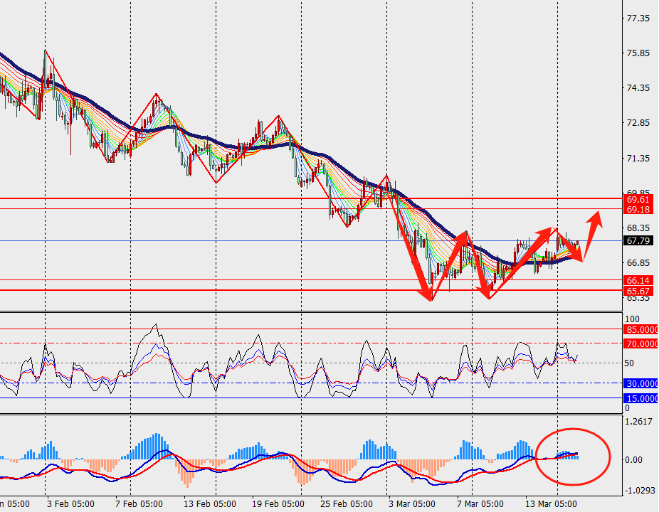 技术面:原油H4级别震荡反弹,并在48日多空分界线上方运行。此外,MACD双线和量能柱在零轴附近收敛。当前原油市场正处于多空博弈的关键阶段,中东局势与中国经济政策动向是驱动行情的核心变量。